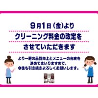 9月より新価格にてクリーニングサービスをご提供させていただきます。 どうぞよろしくお願い申し上げます。 ワイシャツ回数券は9月9日(土)まで、既存価格にてお買い求めいただけます。 また、2024年1月末日までは、価格改定 …