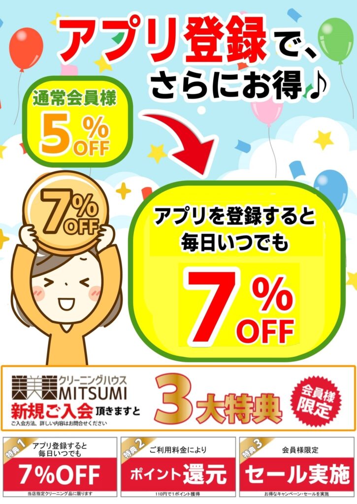 特典①毎日いつでも、当店指定クリーニング品が5%OFF! 【アプリ会員様は同7%OFFと大変お得です】