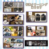 着物、袴、帯、襦袢などの和服全般から、白衣、制服、作業着などビジネスシーンで着用するお品物まで、数多くのクリーニングアイテムをお受けできます。布団・毛布・絨毯といった生活アイテムはもちろん、剣道防具・スキースノボウェアー・道着・スニーカー・ぬいぐるみ、ベビーカー、チャイルドシート、日傘なども「みつみ」にお任せください。