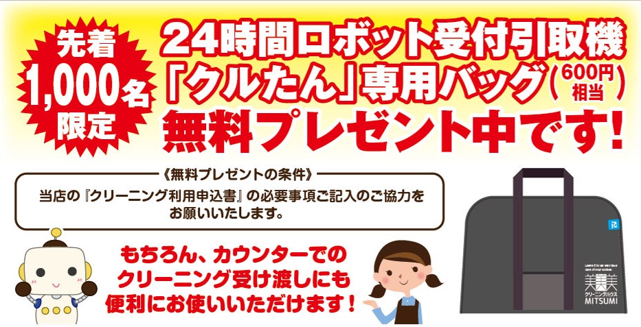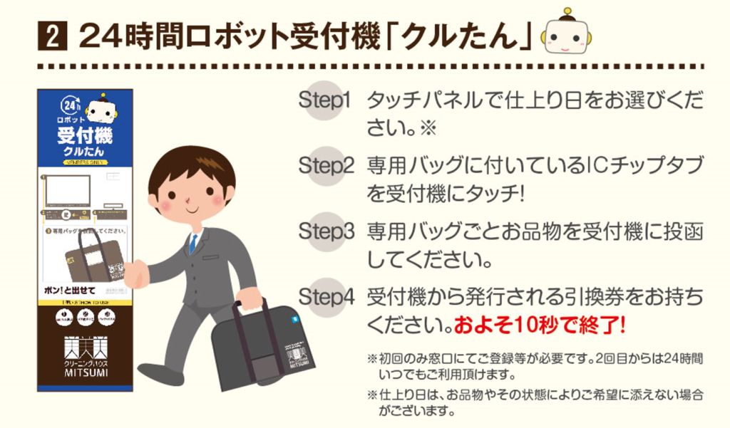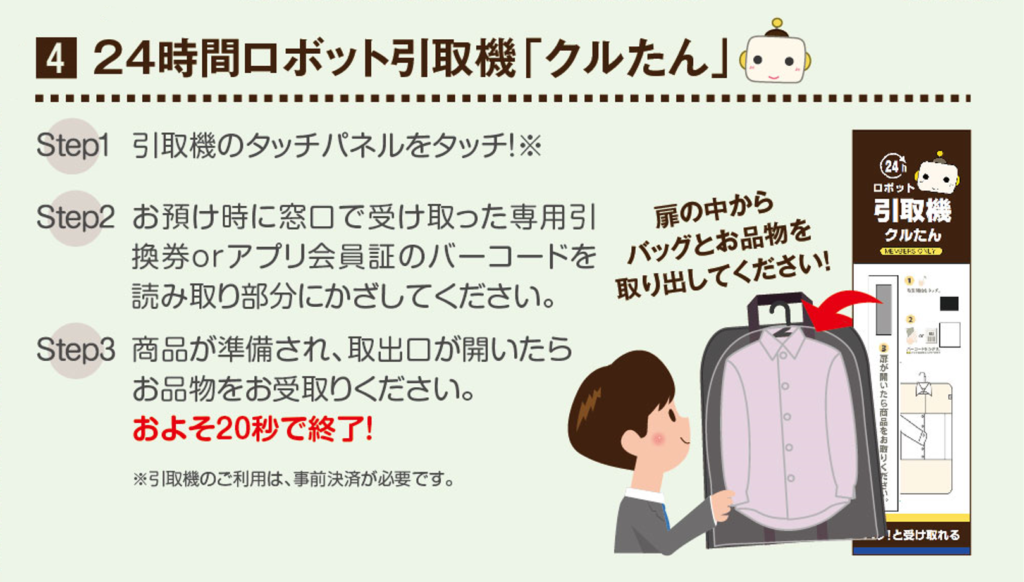 • 24時間ロボット受付引取機『クルたん』が使える(専用バッグが必要です)