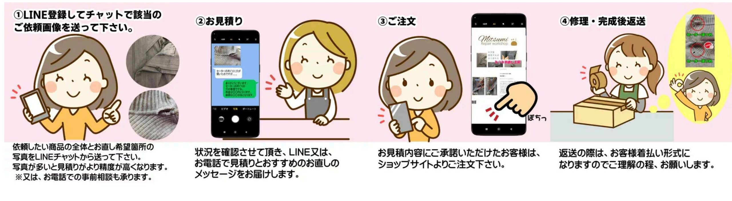 「みつみお直し工房」は、クリーニングハウスみつみの一部門として、20年間にわたって地域の皆様から信頼を得てきました。これからも品質とサービスにこだわって、お客様の衣類のお直しをお手伝いします。どうぞよろしくお願いいたします。