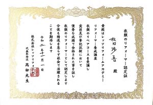 当店は、「衣類のリフォーマー」認定資格者のいるお店です。