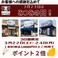 📢 3月23日はみつみの日! 🧺✨ お客様に感謝を込めて 【ポイント2倍キャンペーン】を開催します! 🗓 期間:3月22日(土)~3月24日(月) 🛍 対象:全店舗の店頭にてクリーニング1会計税込¥1,000以上ご利用の …