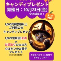 10月31日(金)限定!○○クリーニングではハロウィンイベントを開催🎃 1,000円以上のご利用でキャンディをプレゼント🍬 お受け取りのみの方にも心ばかりのお菓子をご用意。 スタッフも店内もハロウィン仕様で、ちょっと楽しい1日をお届けします🧡