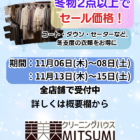 去年の冬物、洗わずにしまっていませんか?クリーニングハウスみつみでは、コート・ダウン・セーターなどの冬物衣類を対象にお得なセール開催中。2点以上でセール価格、素材に合わせたやさしい仕上がりで冬支度をサポートします。