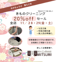 七五三後のお手入れや、年始・成人式の晴れ着準備に。11/28・29(金・土)限定のきものクリーニングセール開催。シミ抜き専門店が大切な着物を丁寧に点検・ケアします。