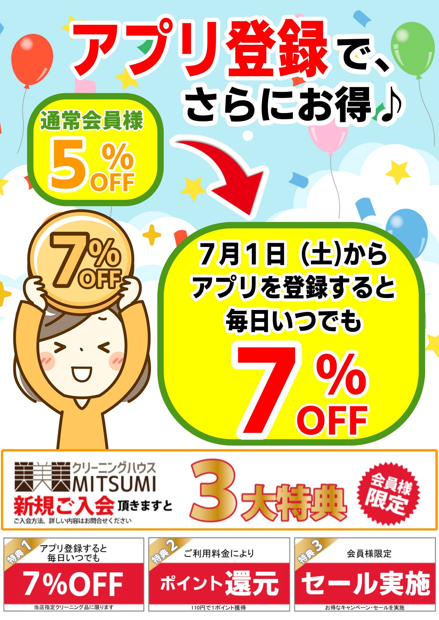「毎日いつでも当店指定クリーニング品が5%OFF」でしたが、改定後の「アプリ会員様」は