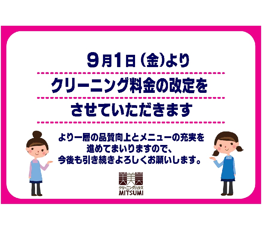9月より新価格にてクリーニングサービスをご提供させていただきます。