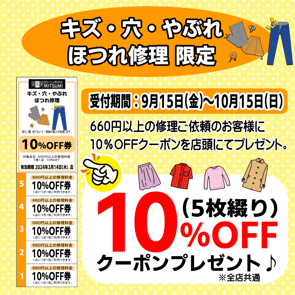 この度、感謝の気持ちとして、【キズ・穴・やぶれ・ほつれ修理】をご利用いただいたお客様には、半年間有効の10%OFFチケット(5枚綴り)を差し上げます。このチケットは、次回以降の修理代金から10%割引されるクーポンとしてご利用いただけます。このチャンスをお見逃しなく!