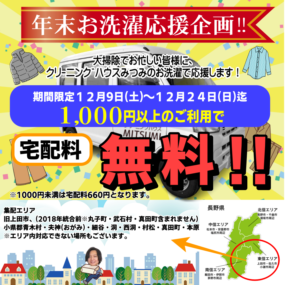 大掃除でお忙しい皆様に、みつみのクリーニングで応援します。 今年の汚れ今年のうちに。 以前よりお客様からのご要望を多くいただいた集配料のご意見を期間限定ではありますが、1000円以上で無料とさせていただきます。 ぜひこの機会にご利用ください。