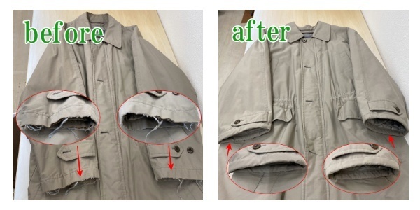 📝コートの袖を2.5㎝丈詰めいたしました。愛用されているコートの袖口が傷んできたのが気になって修理の相談でご来店されたお客様です。拝見させていただくと、襟・身頃は問題なく、袖口だけが傷んでいましたので、縫い代を最小限にしての丈詰めをお勧めしてお直しさせていただきました。お受け取りの際、「きれいになった!相談して良かったわ。」と喜んでいただきました。(^^♪