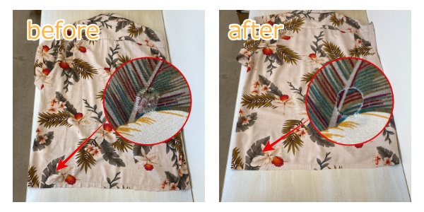 📝アロハシャツの破れをお直しいたしました。車に引っ掛けて破れてしまったので、穴が大きくなる前に直してほしいとのご依頼です😲同じ柄の共布はありませんので破れた個所と似た柄を見返し部分からいただき、一般的には柄合わせをした布をミシンで補強する方法ですが、生地が柔らかいので、接着修理をさせていただきました。お客様に喜んでいただけました。柄合わせが必要になる修理もこちらのケースで対応できるものもありますので、諦めずにご相談くださいね(^^♪