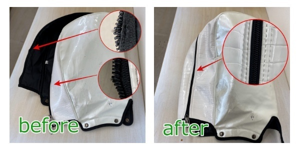 📝バッグ・ファスナーの全交換をさせていただきました。コイルファスナーのコイル縫い止めの糸が傷んで切れており、補強では難しい状態でしたので全交換での対応となりました。ファスナーのカーブ部は使用で負荷がかかり傷みやすい部分ですので全交換になるケースが多くあります。中には部分的な補強で対応できるケースもありますので、お気軽にご相談くださいね☺