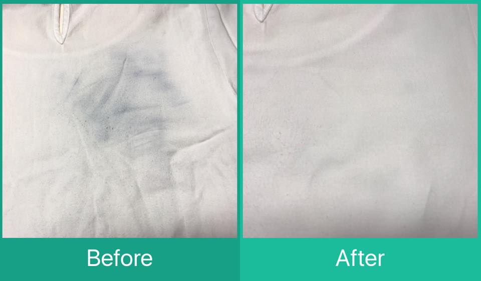 生地の中まで擦り込まれたような色移りでしたが、じっくりシミ抜きを行い、きれいにできました〜(*´꒳`*)