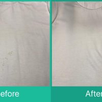 カットソーに、不明のシミ汚れ。 真正面の一番目立つところに、シミが浮き出てしまっておりました〜 柔らかな生地の風合いを損ねないよう、細心の注意を払ってシミ抜きを行いました!